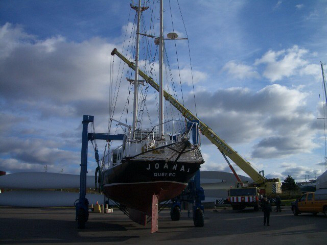 So, the company Irving had been in town trying to put some wind turbines up just down the road. These turbines were being delivered onto the pier and off-loaded with a nice big crane, just the right size to lift Joana. I sent dad in to investigate. He got the scoop. It would take two lifts for her (basically they wanted to lift us, set us down, then pick us back up again and then into the water). They would have to split it between jobs of unloading the turbines. And it would cost a few thousand each lift. Hmmmm. What to do, what to do. Understandably, we weren't ready to say OK just yet.